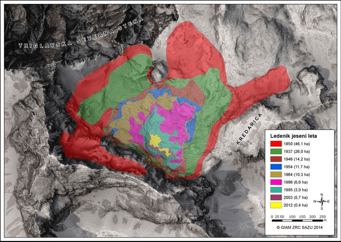 Obseg Triglavskega ledenika od srede 19. stoletja do leta 2012